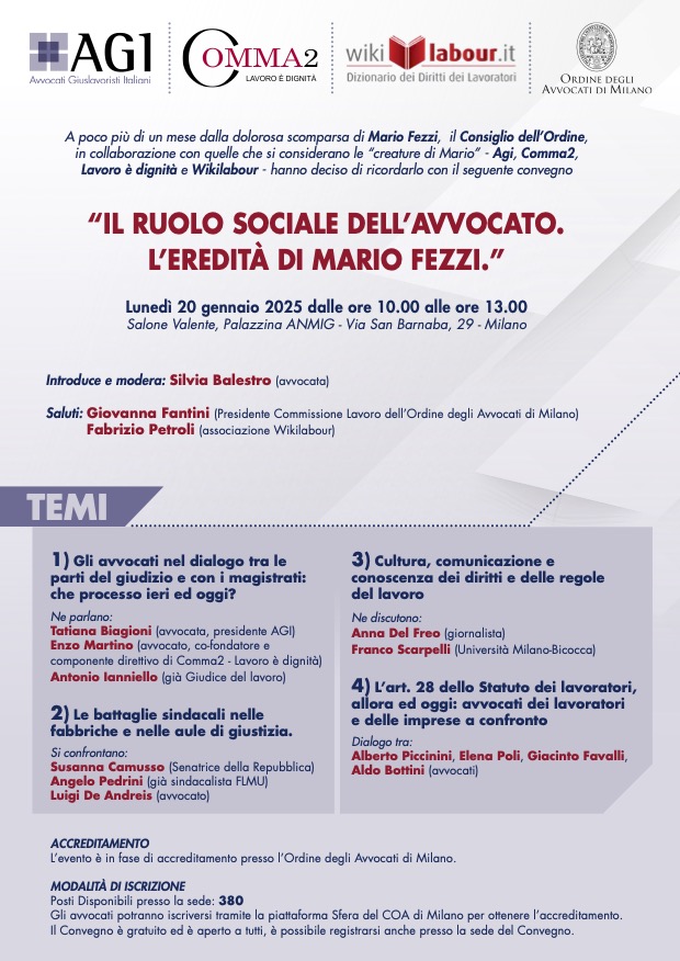 Segnaliamo alle associate e agli associati che il Consiglio dell’Ordine degli Avvocati di Milano, in collaborazione con Agi, Comma2, Lavoro è dignità e Wikilabour - ha deciso di ricordare Mario Fezzi con il seguente convegno: